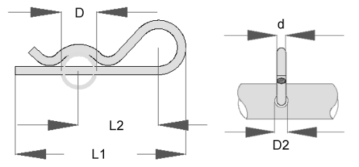 Federstecker einfache Ausführung in 20 Abmessungen aus Normalstahl EN 10270-1 mit verzinkter Oberfläche (rostbeständig, max. Temperatur 200 Grad) für Wellen- und Rohrdurchmesser (D) von 6 bis 55 mm.